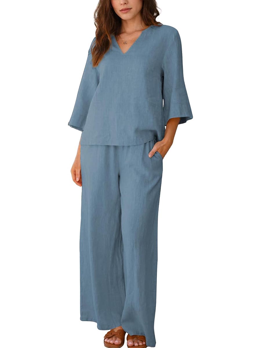 Women's Casual V Neck Top Wide Leg Pants Matching Set (Buy 2 Free Shipping)