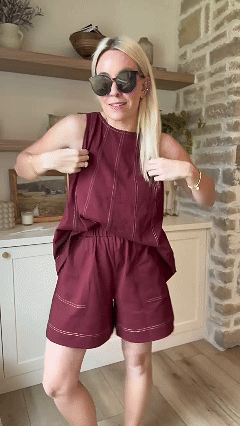 This set features a high neckline, low armholes and contrast raised seams. The top is long and loose. The shorts are pull-on and have side pockets, coordinating seams and a loose fit.